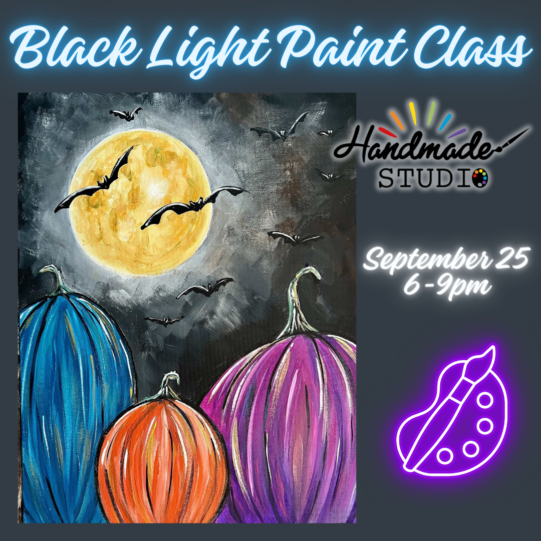 Join us on 9/25 at 6pm for a fun, step-by-step acrylic paint class creating a spooky full moon pumpkin scene. We’ll start by painting the base with all lights on, then switch off the lights to add glowing neon details under black lights. No experience needed—just bring your creativity, snacks, and drinks to enjoy a relaxed, exciting evening of art and fun!