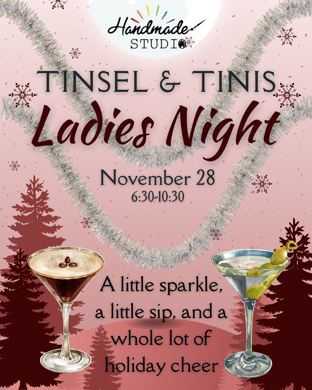 Grab your best gals and get ready to sip, snack, and get your paint on at our coziest (and sparkliest) night of the season! Tinsel & 'Tinis is all about kicking off the holidays with creativity, cocktails, and good company.